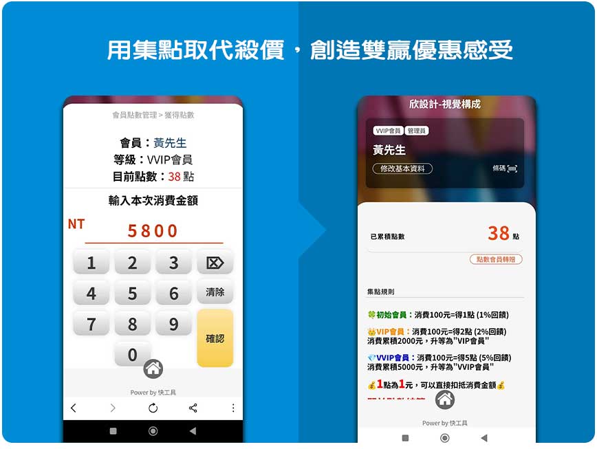 平面設計行業難以給出明確的價格標準,過去經常報價後,面臨客戶殺價的情形,不僅利潤縮減,也讓服務品質難以穩定。欣設計導入快工具的「集點回饋」功能後,開啟全新優惠模式:每筆設計案根據金額給予1-10%的點數,累積後可折抵未來消費。這樣的方式讓客戶感受到實質優惠,又不需尷尬議價,同時鼓勵客戶回流,提高設計案的續單率。比起單次殺價,長期經營更能累積信任與價值,讓設計成為持續的品牌合作關係。