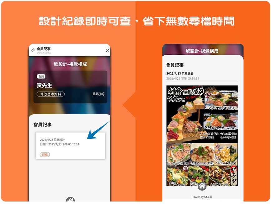 客戶不需再透過電話或訊息詢問,隨時可以登入查看,無論是重新印製、修改,還是參考舊案,都更加方便。這項功能不僅大幅減少設計師的非設計工時,也讓客戶感受到更高的服務效率與自主權。