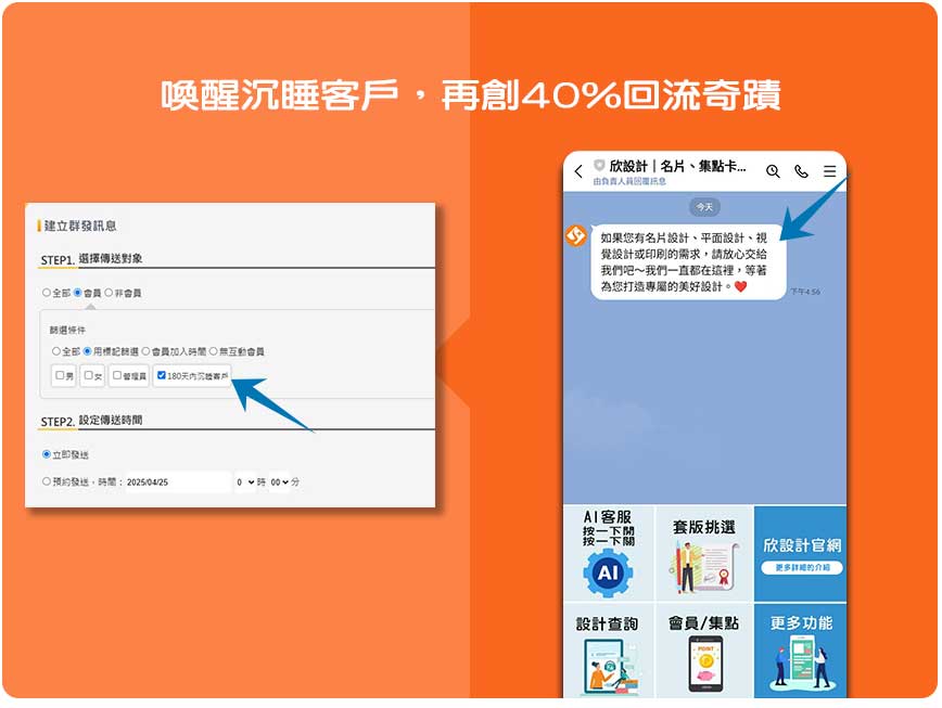 曾經合作但許久未回訪的客戶,對許多設計公司而言,是既可惜又難以主動經營的一群。快工具的「客戶喚醒功能」幫助欣設計有效追蹤這類客戶動態,若超過一定時間未有互動,系統會自動發送關心訊息,例如「我們好久沒合作囉~最近有需要設計DM嗎?」這樣自然親切的提醒,非侵入式又能重啟話題。實際統計,導入此功能後,有高達40%的沉睡客戶再次下單,為設計團隊帶來穩定的案件來源,也強化了品牌與客戶的長期關係。